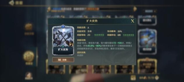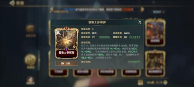 浅析:技能携带者,在本回合内,未发动主动技能,则下一回合能提高自身主动技能的发动概率,并且主动技能发动成功后,还能有概率提高自身属性,且叠加到战斗结束。可以看出该技能属性加成非常得高,主要也是搭配准备队使用。