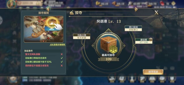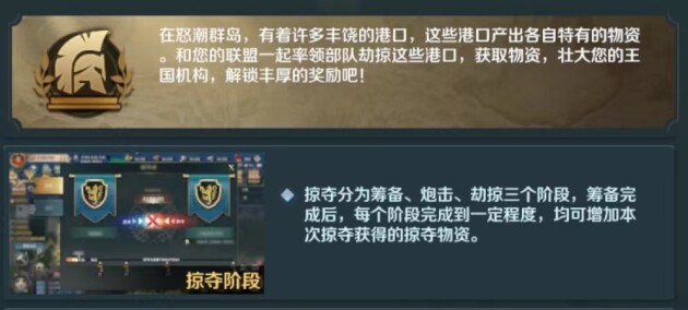 玩家可以通过联盟王国机构中的港口情报塔进行助力,加速建造私掠舰,驾驶战舰对敌盟港口发起掠夺战,夺取敌对联盟的物资。