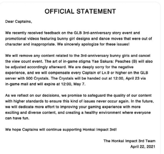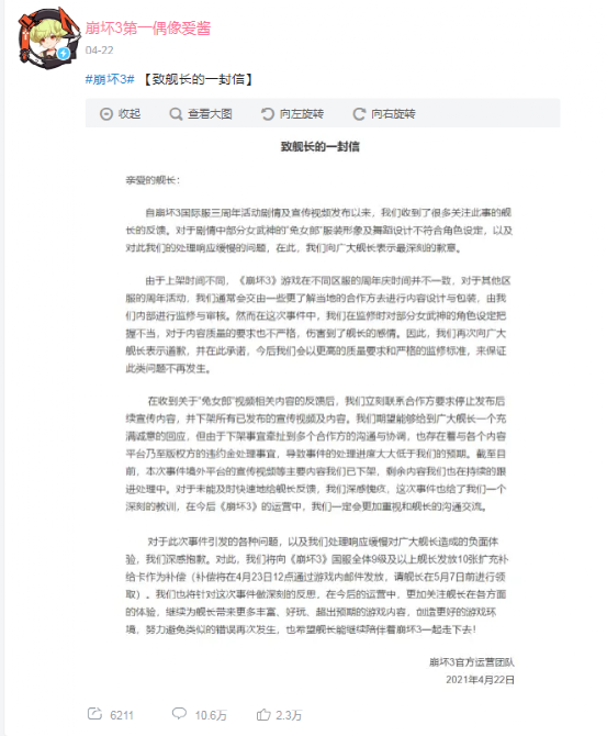 而这些处理方式只会让玩家认为米哈游在逃避问题,对玩家的反馈并没有重视。米哈游官方对兔女郎事件绝口不提,仅在4月2日,对于台湾一名有不当言论的coser解除合作。