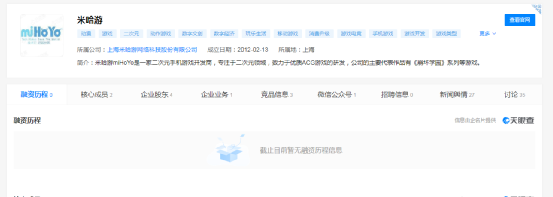 据天眼查APP显示,米哈游成立于2012年,融资历程一栏为0。前段时间,还曾传出米哈游拒绝腾讯、字节跳动投资的消息。同时,米哈游也还没有上市进入二级资本市场。