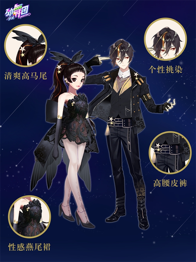 男款星光熠熠为白色衬衫打底,搭配黑金马甲,再配上黑金配色的夹克外套,色彩上高贵靓丽,十分吸睛;服饰上的小配饰可圈可点,凸显夏日星辰般的美;服饰整体再配上挑染金发,衬得人意气风发、帅气迷人。