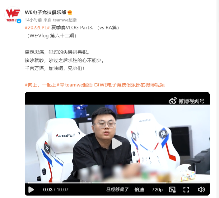 昨天,WE官博也放出了最新一期的夏季赛Vlog,里面记录了在输给了RA后,队员和教练的情绪都不太稳定,赛后聚在一起复盘和讨论。上路BiuBiu懊恼地表示:“我也不知道我是比对面上单差哪里还是干嘛,我玩的真的很累很累,什么都不来上路,真的,上路就每天一个人玩”,WE教练Viod则直言:“在我看来赢不了比赛的职业选手就是垃圾,我也是垃圾”