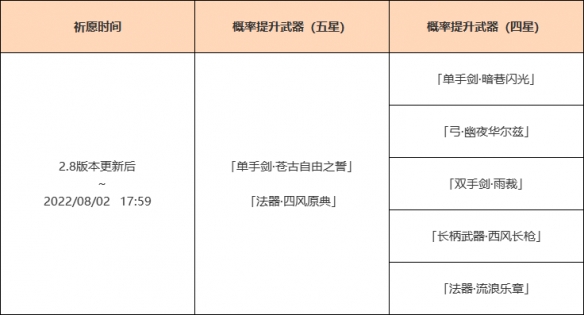 ●活动期间,可使用「神铸定轨」对本期五星UP武器「单手剑·苍古自由之誓」或「法器·四风原典」进行定轨,更多「神铸定轨」详细规则可点击祈愿界面左下角【详情】按钮进行查询。