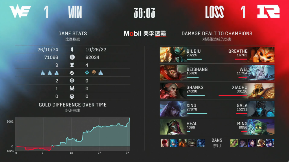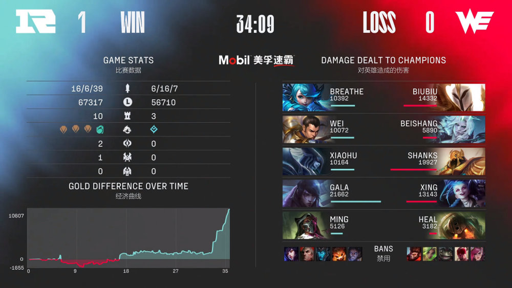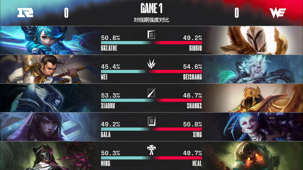 第一局比赛,RNG蓝色方,禁用塞拉斯、纳尔、卡莉斯塔、斯维因、狐狸,选用Breathe格温、Wei赵信、Xiaohu冰女、GALA厄斐琉斯、Ming烈娜塔;WE红色方,禁用猴子、泽丽、塔姆、盲僧、蔚,选用Biubiu天使、beishang佛耶戈、Shanks沙皇、Xing金克丝,heal泰坦。