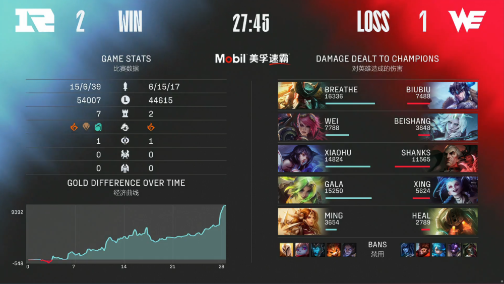 进入决胜局后,RNG再没有给予WE任何机会,以一场酣畅淋漓的速胜局,在27分45秒内,轻松击溃了WE!这种速胜局,没有什么好复盘的,WE苦战三局,再次与首胜失之交臂!