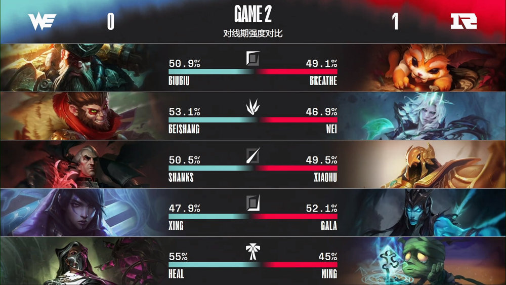 第二局比赛,WE蓝色方,禁用丽桑卓、塔姆、泰坦、格温、盲僧,选用Biubiu船长、beishang猴子、Shanks乌鸦、Xing厄斐琉斯、Heal烈娜塔;RNG红色方,禁用泽丽、塞拉斯、狐狸、飞机、猪妹,选用Breathe纳尔、Wei佛耶戈、Xiaohu沙皇、GALA卡莉斯塔、Ming阿木木。