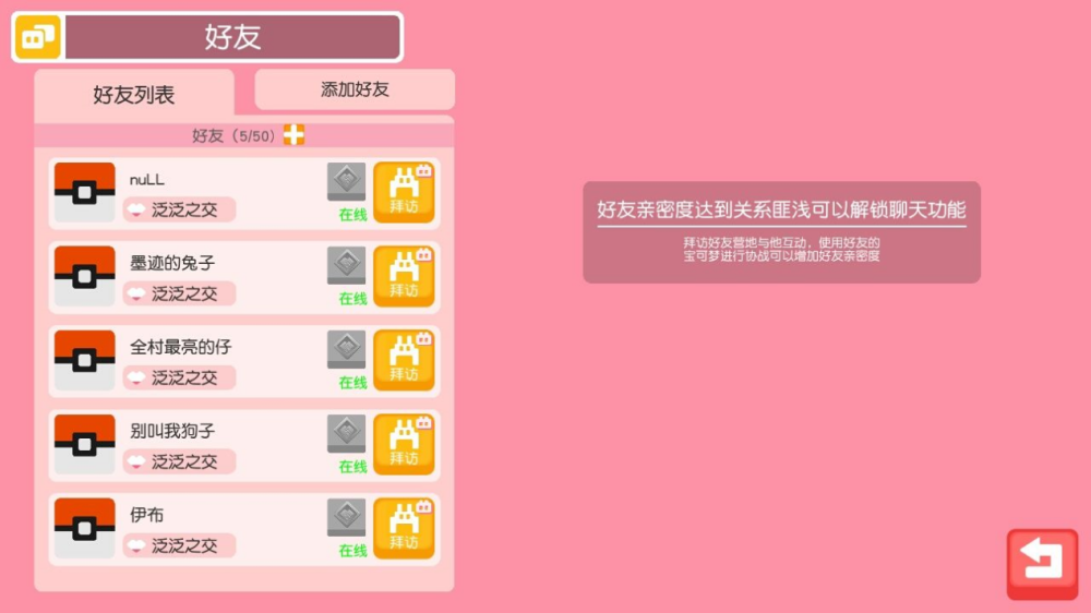 《宝可梦大探险》是一款集战斗、探索、养成于一身的游戏,玩法非常休闲。在战斗中,游戏放弃了操作感和战斗深度,不需要控制走位移动,只需要简单释放技能即可,这对于喜欢休闲游戏的玩家来说,是一个非常贴心的设定。值得一提的是,《宝可梦大探险》比较注重玩家之间的交流,每个好友都有不同的亲密度关系。好友之间可以互相拜访,互送礼物,甚至开启友谊赛切磋。除此之外,作为宝可梦系列核心的PVP联机玩法,本作中还加入了段位概念,提升段位还可以获得相应奖励。在游戏中,各位探险家不但可以与宝可梦一起玩耍,还可以与其他玩家交流互动,一起享受方块岛的精彩冒险。