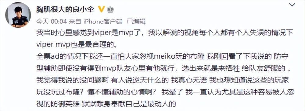 在大多数观众的眼中,小伞的解说还是不太有倾向性的,比较专业和公正。而就在EDG于OMG的比赛中,EDG赢下后,小伞虽然将票给了viper,但话里话外也想说明一下辅助的重要性,结果被认为是给meiko拉票,也被冲了。当然也可能和OMG赢了伞皇露出了笑容有关系,毕竟所有人都知道他是OMG的前队员兼粉丝。
