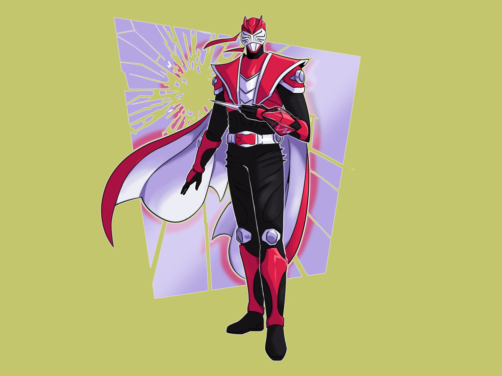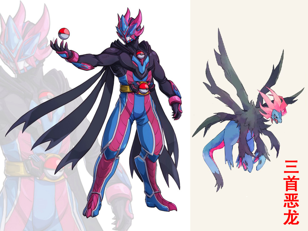 最后是根据宝可梦三首恶龙设计的假面骑士,全身被黑蓝粉三色护甲包裹,背后披风一分为六,对应三首恶龙的翅膀,头盔以蓝色为主,粉色的假面像火焰般展开,看起来既帅气又邪恶,有反派大BOSS的气质,