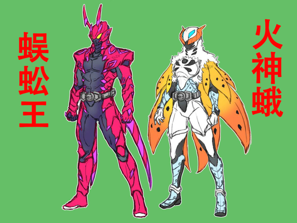 有些网友喜欢以怪兽型宝可梦为主题设计假面骑士,上面两个就是根据蜈蚣王与火神蛾设计的精灵骑士,蜈蚣王擅长快速近身格斗,每次攻击都会将毒素注入对手体内。火神蛾像怪人,颈部有白色绒毛围巾,身上有大中小三对披风,上面的黑点对应火神蛾虫翼上的鳞粉,看起来很危险的样子。