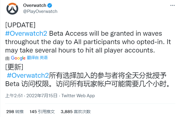 IT之家 7 月 15 日消息,守望先锋官方现表示:《守望先锋》“归来”Beta 测试将会向所有提交申请的玩家开放,授权可能需要几个小时才能到达所有玩家的账户。
