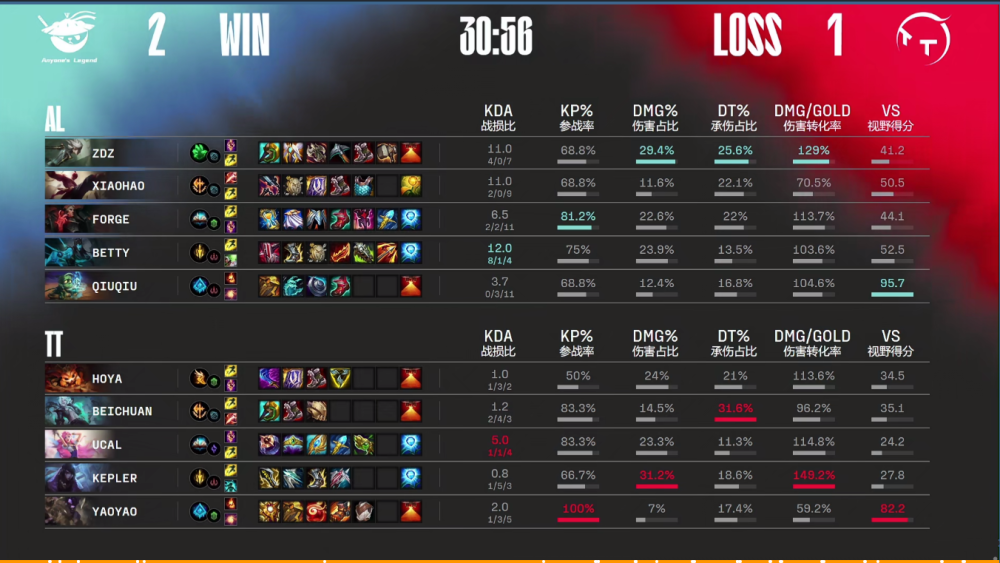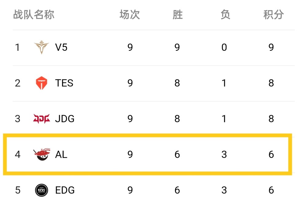 那么在目前的最新赛程当中,我也是看到了al战队以2:1的战绩击败了tt战队,那么伴随着这一场比赛的结束,也宣告着al战队的积分以6胜3负,直接是来到了本届夏季赛常规赛积分排行榜当中的第四名,按照当下的趋势来讲,进入季后赛肯定是没有问题的,而且我们看到这支队伍还有很大的冲劲,甚至有可能获得更好的成绩。