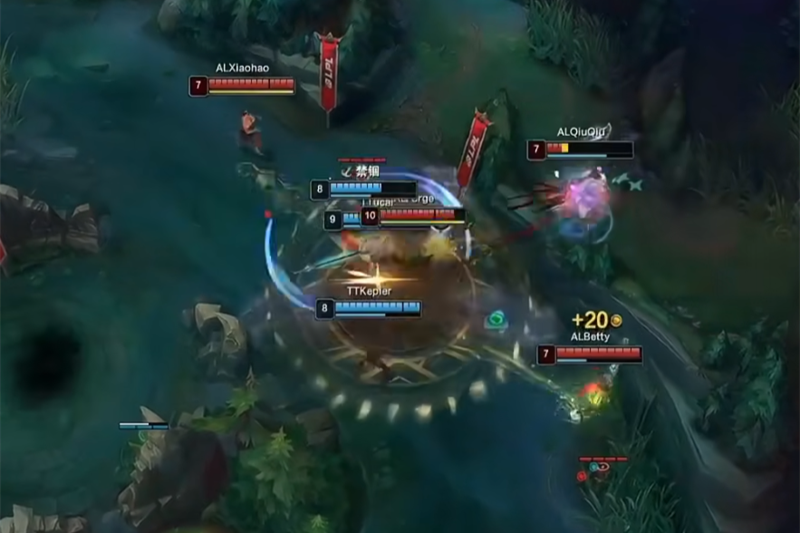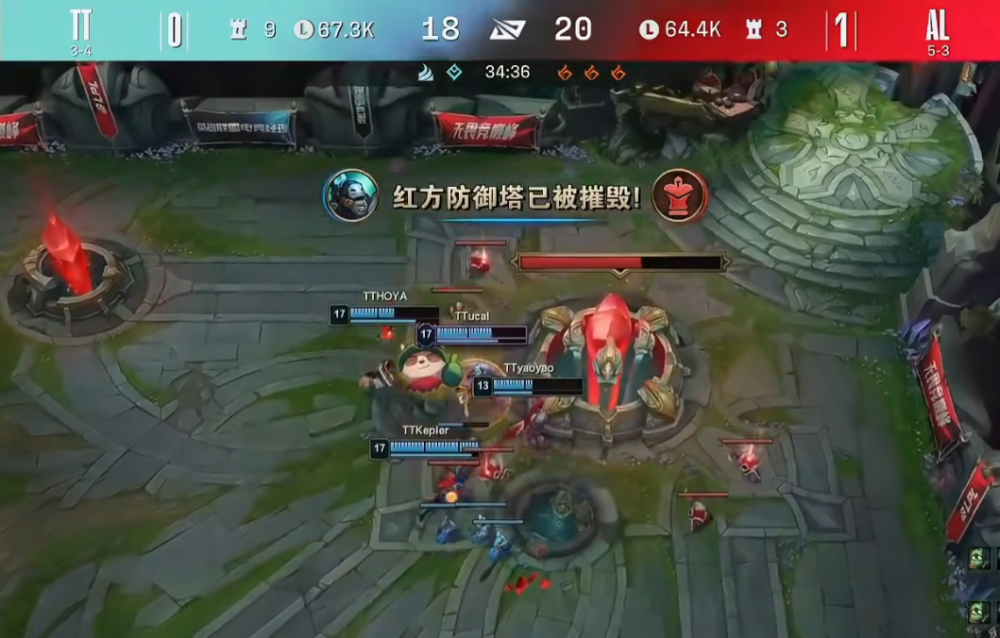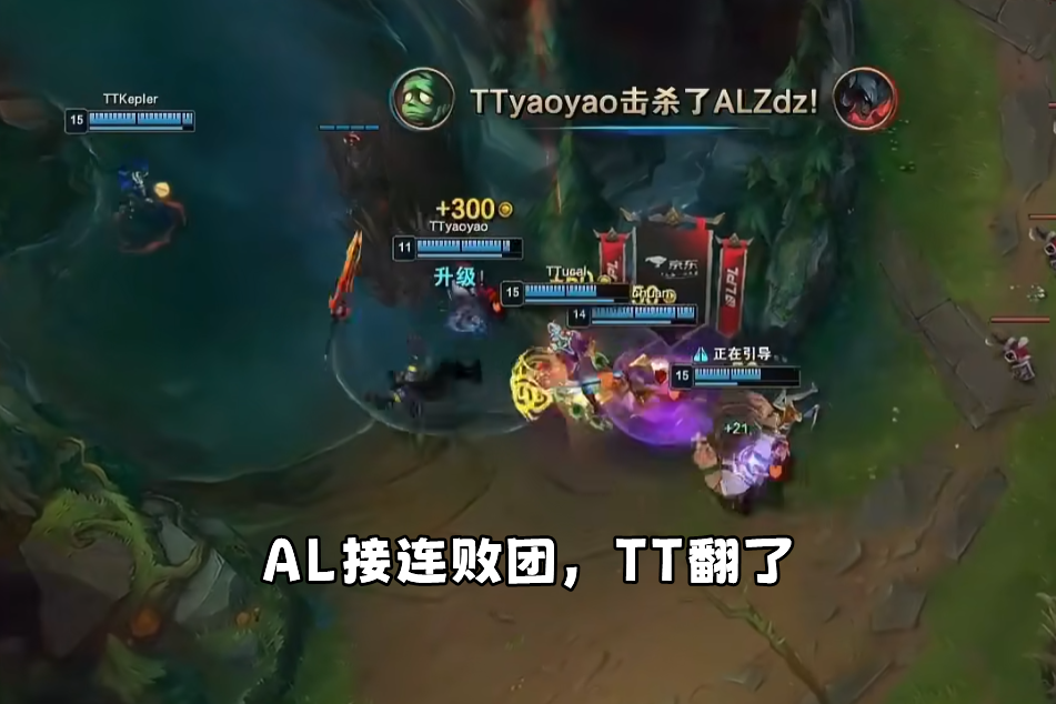 然而TT在经济差了AL一万的时候却开始发力了,yaoyao木木在中路逮到了Betty,在队友的配合输出下,AL开始凌乱了,各种葫芦娃救爷爷的操作,阵容也比较分散,完全是各打各的,这一波TT逆经济赢团,宁王开始慌了。在大龙即将刷新的时候,AL想单抓一波TT上单酒桶,为大龙团奠定优势。然而却被TT众人反打,AL中上两人白给,大龙团危!