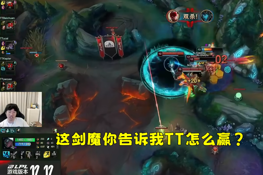 就此,TT的节奏有些控不住了,宁王也是分析道:TT这局基本上是要输了。这不,话语刚落TT就在23分钟的野区团战中被打了一波团灭,Zdz的剑魔一人顶在最前面,配合咳血以及剑魔的回血机制,一人就足以抗住TT数人的输出,并且还打出了成吨的伤害。看到这个无敌的剑魔后,宁王也是更加自信TT这局必输,并且直接结算了这一局的竞猜,给的竞猜结果就是TT输。