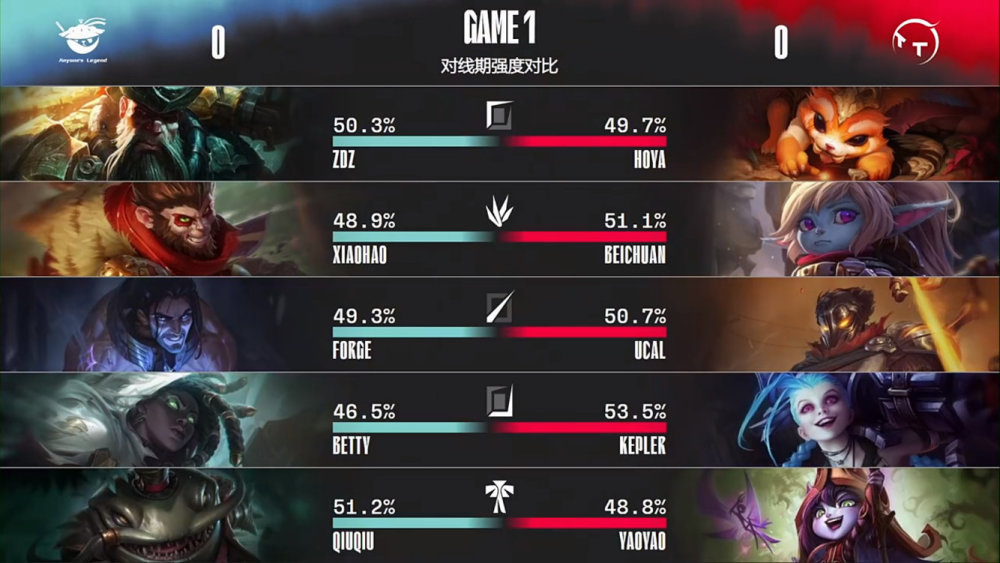 第一局比赛,AL蓝色方,禁用烈娜塔,沙皇,格温,岩雀,飞机,选用Zdz船长、Xiaohao猴子、Forge塞拉斯、Betty赛娜、QiuQiu塔姆;TT红色方,禁用泽丽,卢锡安,滑板鞋,泰坦,巴德,选用HOYA纳尔、Beichuan波比、ucal维克托、Kepler金克丝、yaoyao璐璐