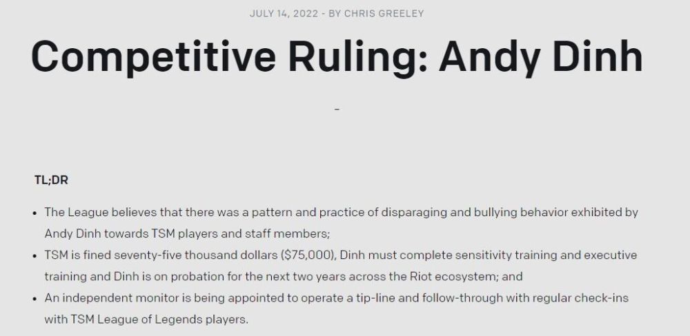 早在去年年底就有多位在TSM工作过的员工在媒体上面指控TSM的老板多次辱骂和欺凌员工,之前TSM和官方曾经组织过调查团来调查此事,之前不久TSM的调查团队的结果是Reginald不存在欺凌员工的现象。