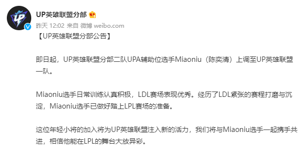 另外,UP战队也提上二队的辅助Miaoniu,取代了近期表现不佳的ShiauC。