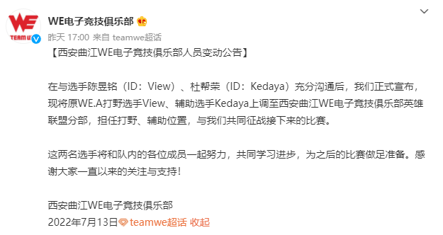 就连联赛垫底的WE都从二队提上来VIEW和Kedaya两名选手。