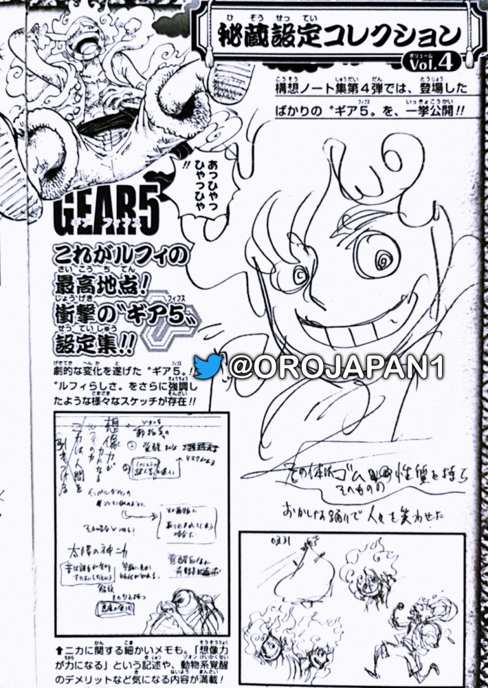 官方在第四期的资料图《Road To Laugh Tale》首次公布了尾田大神在创作【太阳神尼卡路飞】时的全部设定稿,虽然都是被废除的,但可以看出尾田最初的想法是怎样的,也可以让我们认识一下【尼卡路飞】。