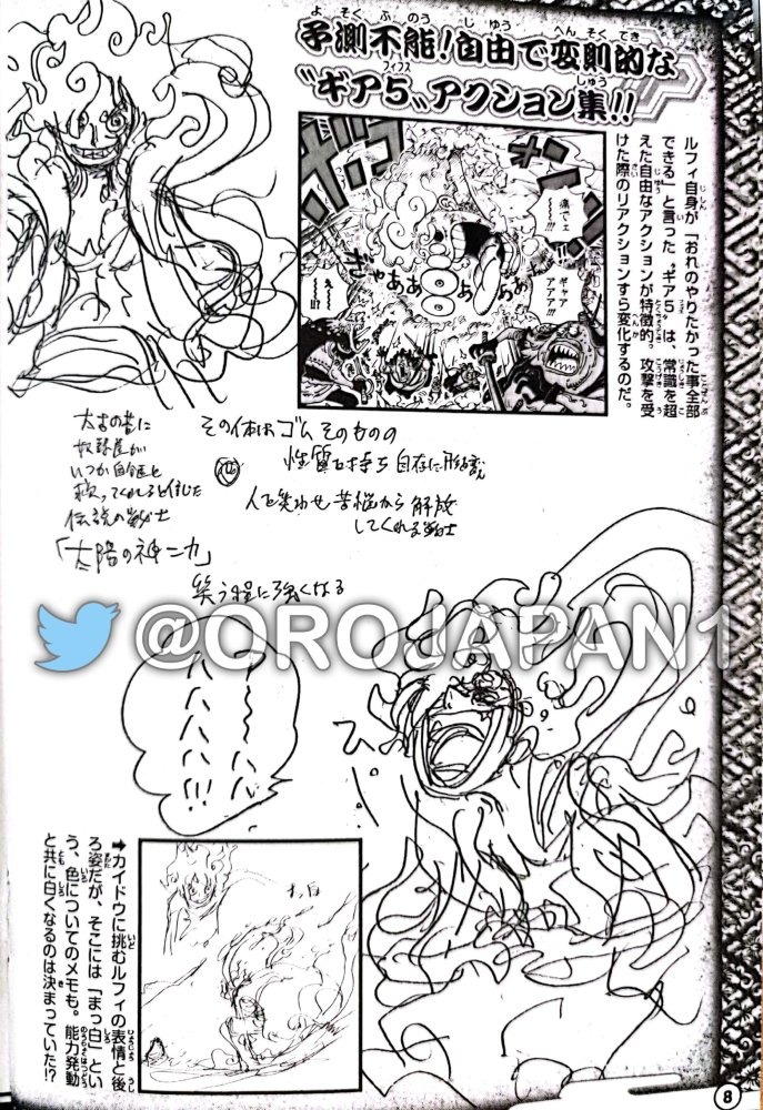 这一页补充了战斗过程的尼卡路飞的造型,哈哈大笑的画面还真符合这颗果实的精髓以及路飞的性格。同时在边框里面官方也再次提及【表情变化、衣服全白】的信息。