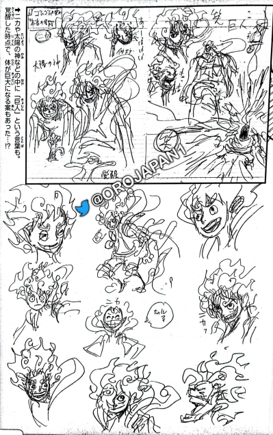 第三页的尼卡路飞设定稿就多了, 在边框里面的造型还出现【巨人】以及呐喊的路飞,样子非常可怕。