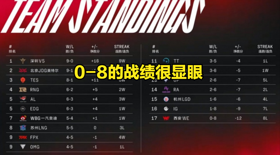 0-8,对于WE来说,这赛季几乎是无缘季后赛了。7月18号面对目前势头正旺的AL,如果还是输掉这场B03,已经可以确认WE无缘本次夏季赛季后赛。其实对于WE老粉丝来说,大多数是为了情怀才去看WE的比赛。WE后续比赛不妨试试”养老队“阵容,XIYE和马哥固定上场,其他几个位置随便换。如果是这样的排兵布阵,就算是输得彻底,被打得毫无还手之力,相信还是有部分WE老粉丝买单的。你觉得WE这次夏季赛会拿到首胜吗?欢迎在评论区留言。