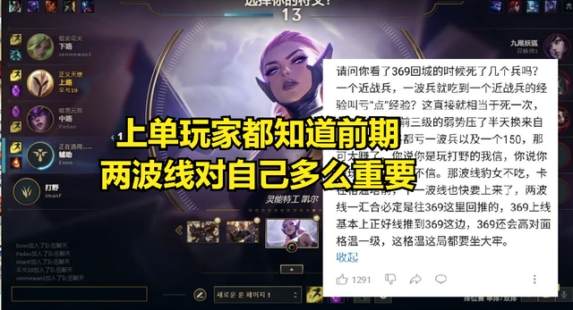 在369兵线被豹女强行吃掉之后,369也是公屏打出问号质问豹女,而豹女却根本没有搭理369,而369在看到豹女吃了自己的线也不跟自己解释和道歉之后也是直播发火,并且在直播当中跟观众们解释:这个线是一个回退线,自己跟格温都有TP,而豹女却选择强行推掉这波线,而这个行为的结果就是格温TP回上路,自己少吃2波线,前期一个助攻根本没有2波线值钱,同时369也是怒喷这个打野太贪了,自己让给他一个人头,他还要恶心队友。