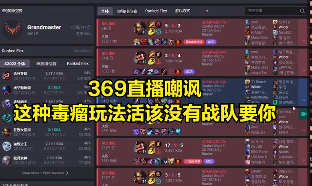 在369被这个打野搞破防输掉排位之后,369也是在OPGG网站上面查询这个打野的战绩,发现这个打野曾经是LCK联赛的职业选手,在LCK联盟没有人要所以最终去了日本赛区打职业,而在日本赛区打了一年之后,就因为表现太差没有任何战队,目前处于半退役状态,而369在看到,这个打野是一个没有人要的选手之后,369也是直播嘲讽:就这种没有团队意识的打野和排位恶心队友的玩法,活该没有人要,这种打野谁要谁倒霉。