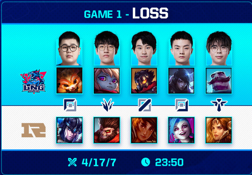 第一盘的纳尔前期配合波比抓到呼吸哥,波比前期的节奏非常好,本来以为LNG可以顺风顺水拿到第一局。没想到中期养出一个拿五杀的金克丝,LNG的击杀数也停留在前期的4个击杀。第二盘熊猫哥也是操刀纳尔,表现比第二盘有所好转,最后一波高地团拍的位置一般,但是LNG打赢了高地团战。决胜局的武器大师,单带体系没打出来,LNG很快就落败了。