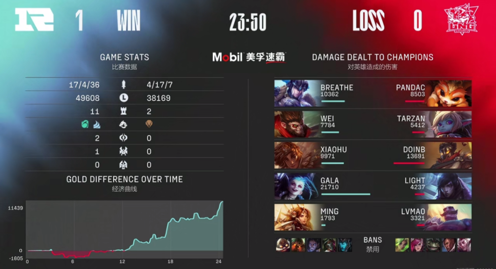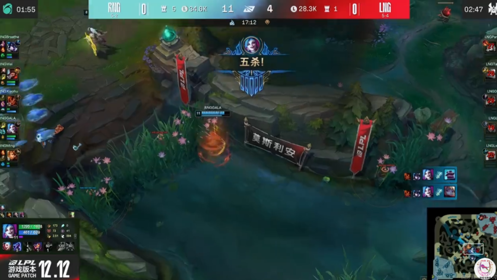 Gala塔下遭到LNG强杀,RNG全员立刻形成支援反打,Gala的金克丝在队友的保护下最终拿到了5杀!而这距离RNG化解LNG的攻势打回经济差仅仅只过了10分钟而已,随后20分钟整RNG借助Gala的无解肥优势,立刻秒掉了大龙锁定胜局。
