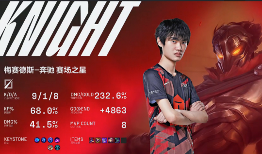 根据统计,Knight的场均输出为20632,场均人头数为5.1,简略计算一下Knight的“头均输出”约等于4000点伤害。而Jackeylove的场均输出为21721,场均人头数为4.1,所以“头均输出”为5400点伤害。