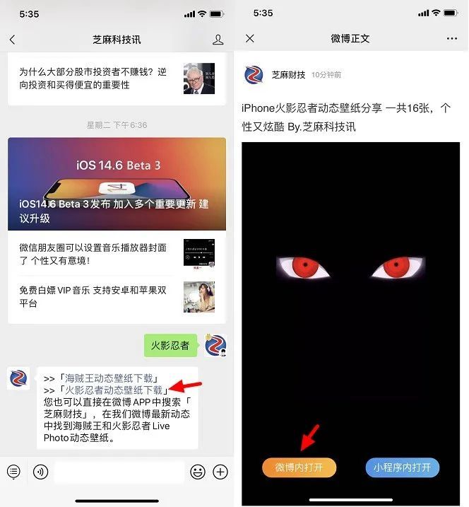 注:微信中打开的微博网页链接,默认直接下载依然是普通静态图片格式(非Live Photo)。因此,需要选择在APP中打开,才能下载动态的。如果手机中没有安装微博APP,也可以选择在微信「小程序内打开」。