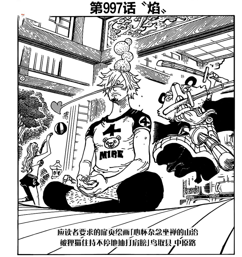 而997话的扉页故事是一位拿着“三根竹棍”的狸猫痛扁色迷心窍的山治,旁边的娜美正是开心的玩球。有趣的是,997话的正片内容恰好是山治被黑玛利亚抓住的桥段,这就说明尾田老师用扉页故事来暗示着当时山治跟索隆之间的表现差距。