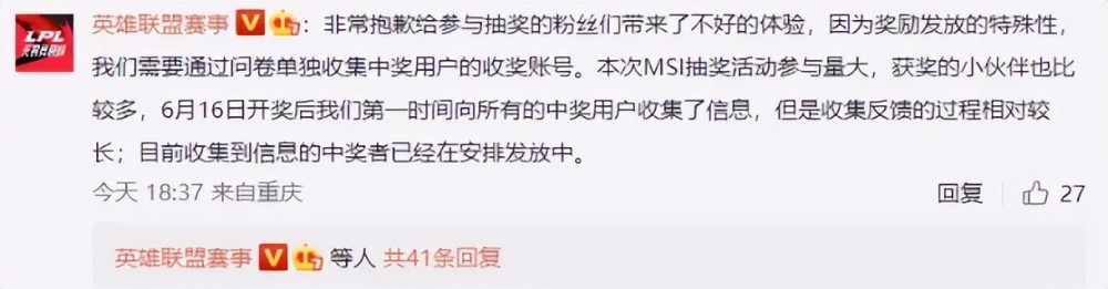 这一条消息发出后评论也引发纷纷反响,LPL赛事官方则对此事做出了回应,官方表示因为抽奖活动参与量比较大,而且获奖的玩家也很多所以导致收集反馈的进度比较慢,现在已经在积极发放奖励了,并且对此事情表示抱歉。而玩家们其实也没有买账,纷纷在评论下方针对官方这一事情而开始阴阳怪气,认为这么大个IP竟然连一点抽奖的奖励都不给观众好好安排。不过现在曝光平台这条微博已经删除,估计是已经将这个问题友好解决了,只是这一番操作确实让玩家忍不住吐槽。