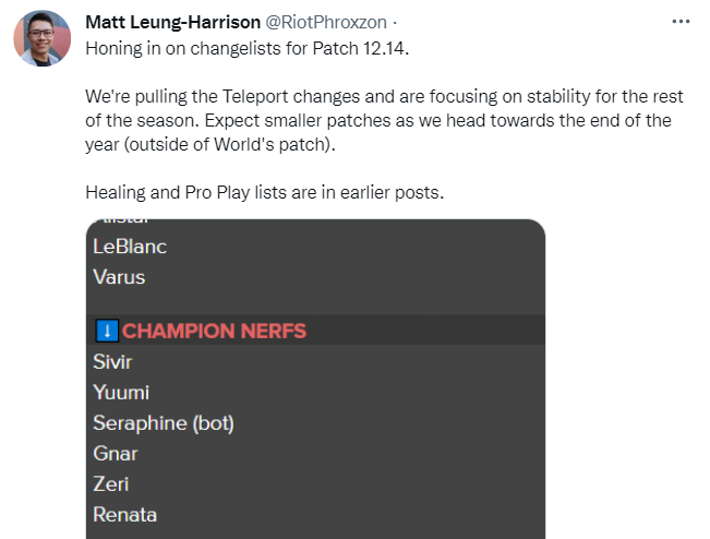 拳头的设计师表示,12.14版本是世界赛开始之前最后的一个有着比较大改动的版本,此后的版本都以小规模的平衡改动为主,这样的版本对于各大赛区的队伍来说无疑是一次新的挑战,联赛的战队格局有可能因此发生改变。