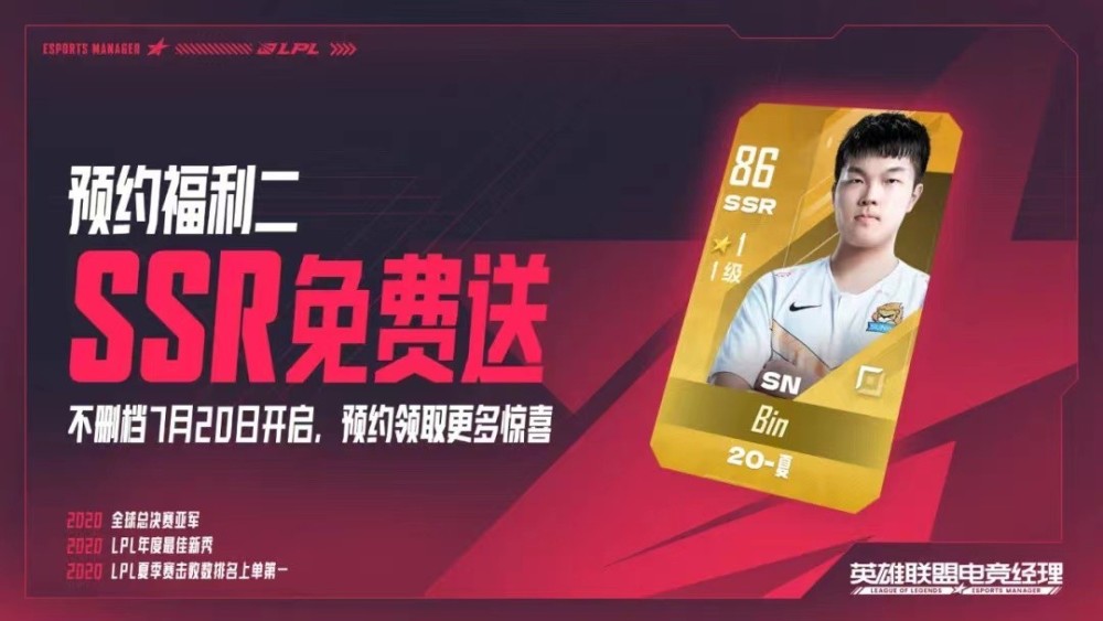 为庆祝上线,所有预约玩家进入游戏将会获得选手签约30连抽机会以及强力选手卡,SSR-SNBin,以保证新俱乐部的起步顺利。