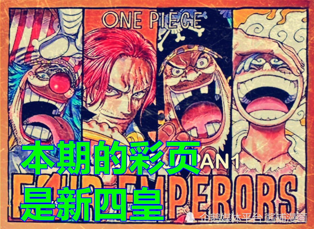 大家好,我是酱铺君。这次的集英社《少年Jump》的彩页,是四位厉害的新四皇,从左边到右边,分别是四皇巴基,四皇红发,四皇黑胡子,四皇路飞,彩页画面上,哥几个都笑得很开心。