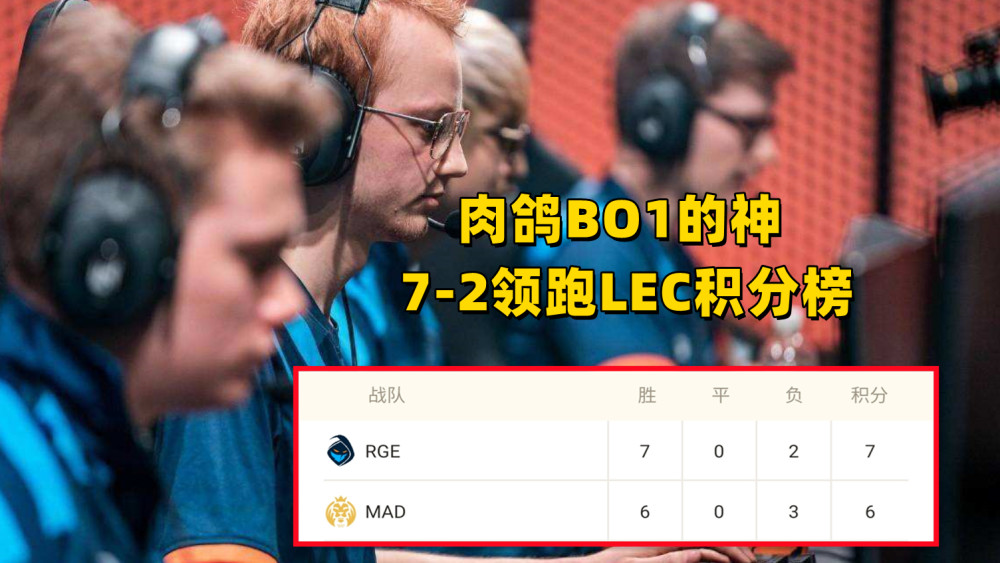 首先在LEC赛区,所有队伍都已经完成了9场对局,距离季后赛名额诞生仅剩下4场比赛,从积分上来看,形势是相对胶着的,目前位列第一的,是BO1战胜RGE,肉鸽已经砍下了7-2的战绩,晋级季后赛的几率非常大,而位列第二的,则是马德里雄狮MAD,目前是6-3的战绩,两队仅有1分的差距,有机会追上甚至是反超。