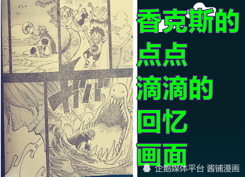 第四,然后进入这段回忆的画面。当时,红发海贼团追赶一艘海兵船,本贝克曼提醒香克斯,船上有CP9的人,但香克斯却不以为然,直接下令进攻那艘船。其实这印证了凌空六子【福兹福】的过去,当时年轻的【福兹福】询问红发海贼团想干什么,并表示船上没有任何财宝,只有一颗不怎么样的恶魔果实,这颗不起眼的恶魔果实很普通,就是个橡胶恶魔果实。而且在漫画分镜中,那个装着【橡胶果实】的小宝箱,就是当初路飞不经意间吃掉果实的时候放在旁边的那个小箱子。第三段回忆,则是香克斯回想着在东海的风车村发生的一切,与路飞在一起的各种样子,以及最后香克斯失去一条手臂,救下路飞的那一刻。而在现实中,香克斯是一边回忆,一边抓着没有手臂的部分,看来他已经百感交集。