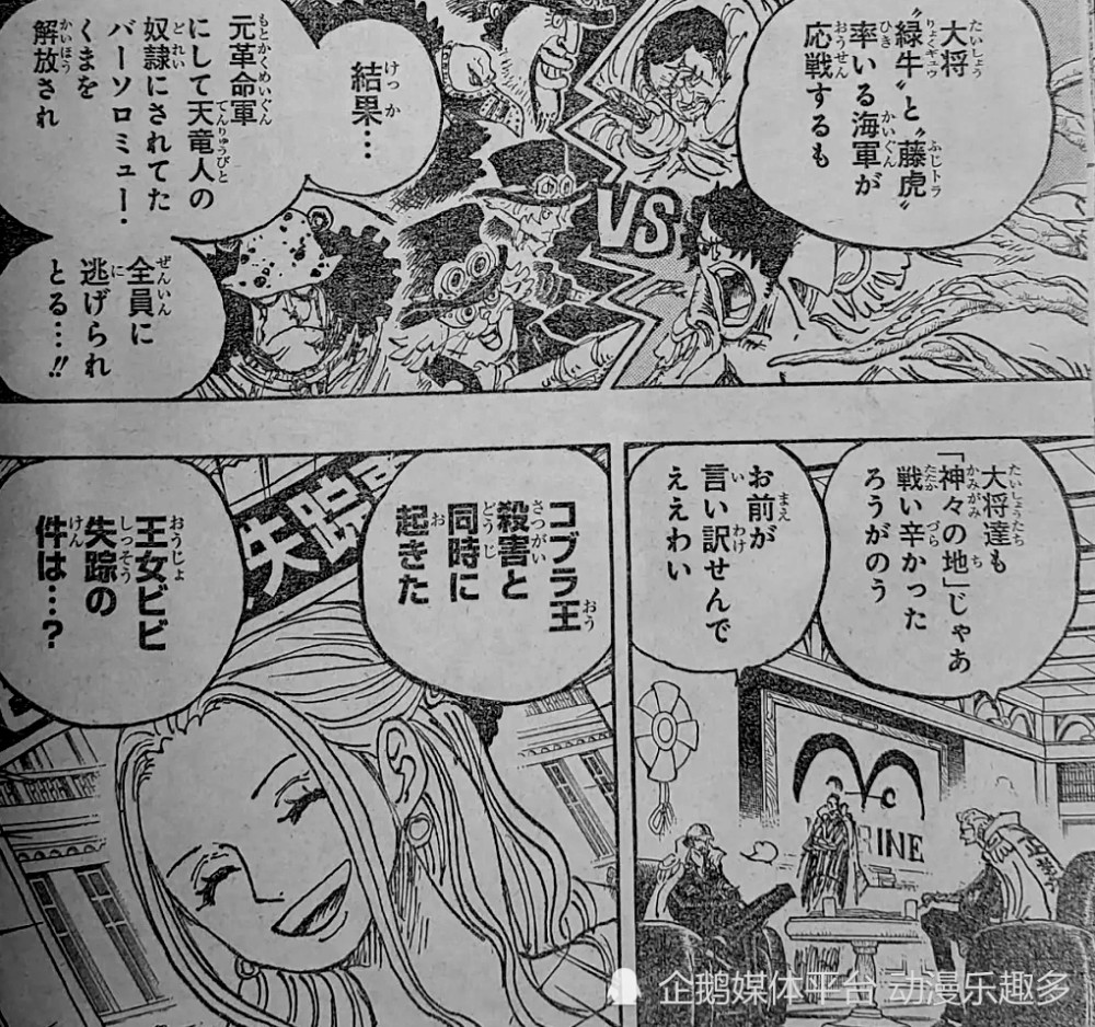 而此时最重大的新闻就是寇布拉之死,海军言之是萨博干的,同时薇薇也神秘失踪,萨博在玛丽乔亚的开战宣告,也让萨博成为世人皆知的存在,影响力已经超过了首领的龙。
