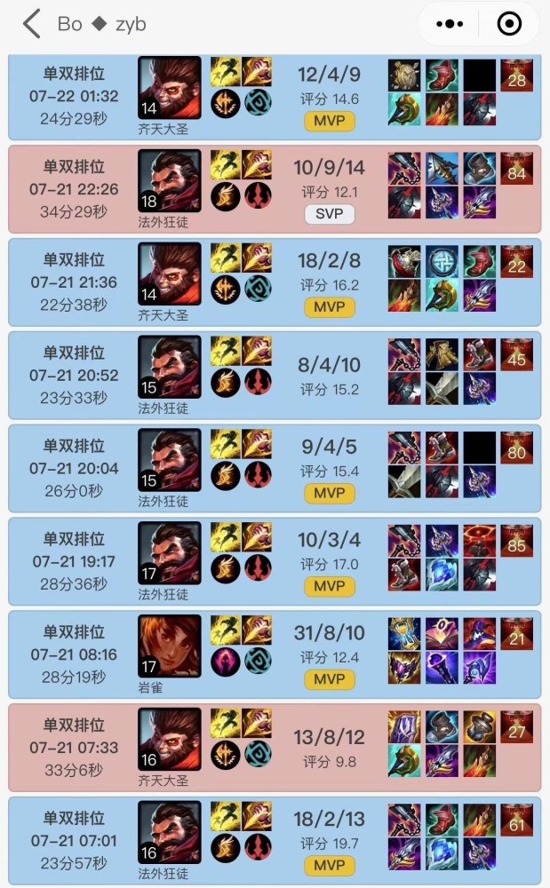 Bo在欧服可以说是上演了疯狂屠杀的场面,最新的战绩如下,近9场Rank中赢了7场,输的2局战绩也都很好,而赢下来的7局中更是拿到了6个MVP,其中有一场岩雀打野战绩31-8,而且这还是欧服高分段的排位。
