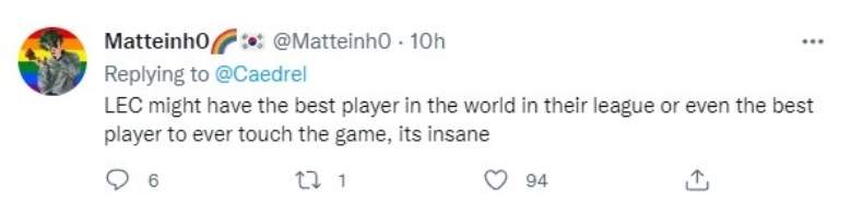 再比如说有欧洲粉丝直接狂吹Bo:在LEC赛区历史上,Bo可能是LEC拥有的世界最强选手,太疯狂了。