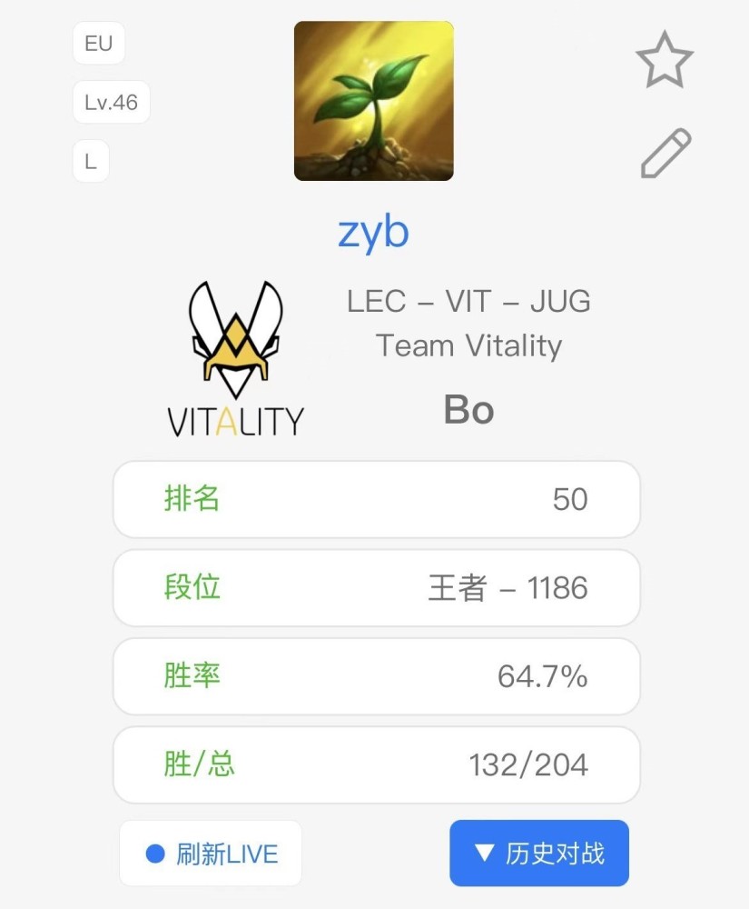 Bo目前是欧服王者1186分,刚好排名欧服第50位,一共打了204局,胜率接近65%。而Bo是7月1日抵达VIT基地的,也就是说用了差不多20天的时间打到欧服王者接近1200分,排名第50位,他的个人能力真的毋庸置疑了。