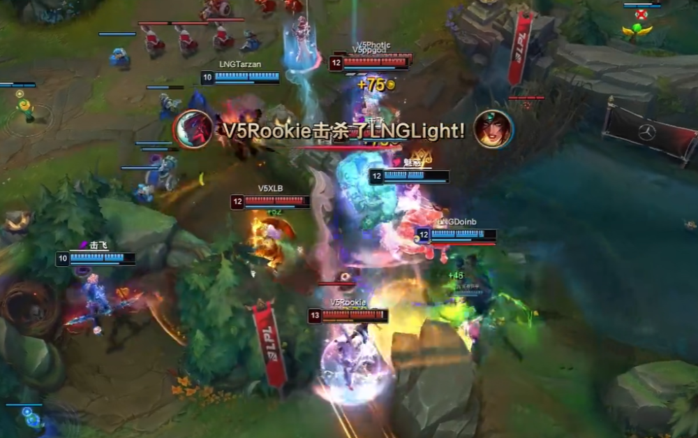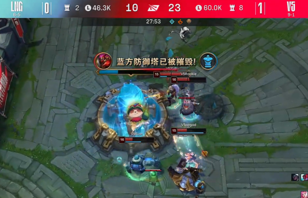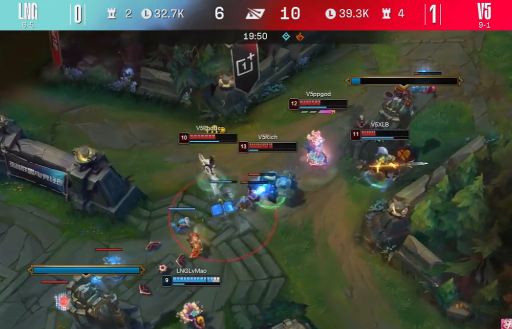 游戏进行到19分钟,两队在中路爆发团战,Tarzan齐天大圣尝试开启团战,但队友无法第一时间跟上输出,反倒是XLB赵信成功切割LNG阵型,打出1换4,顺势推掉LNG中路二塔,胜利的天平朝着V5倾斜而去。