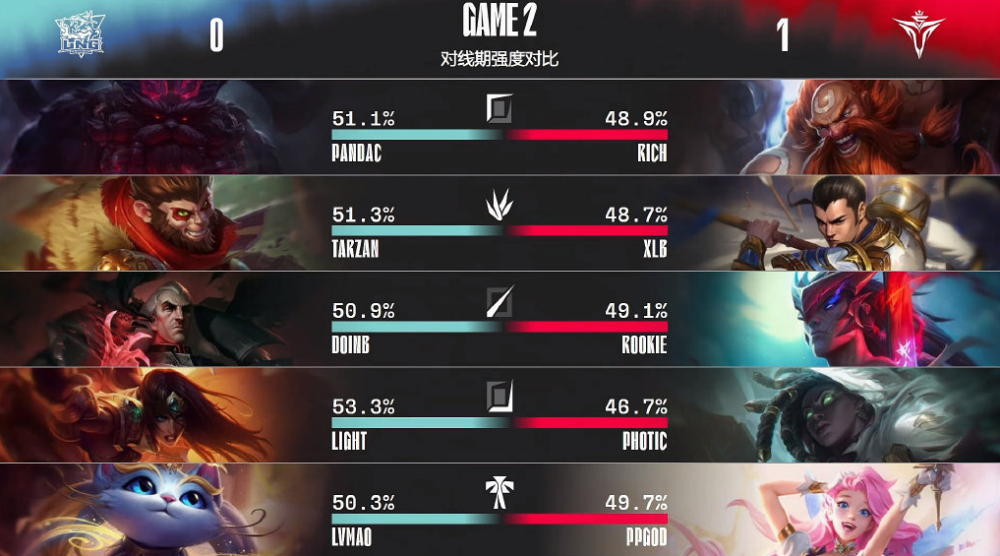 对比V5、LNG最终阵容,V5更加主动,Rich酒桶、Rookie永恩手握线权,同时下路留人能力出众,XLB赵信可以配合Rookie永恩在边路撕开LNG防线,通过推塔拿龙扩大优势;反观LNG,阵容偏后期团战,队内输出匮乏,Carry比赛的压力给到Light希维尔,想要扳平比分,Doinb乌鸦、Tarzan必须围绕下路布置战术,帮助Light希维尔平稳度过对线期,两队在前中期的角逐注定激烈。
