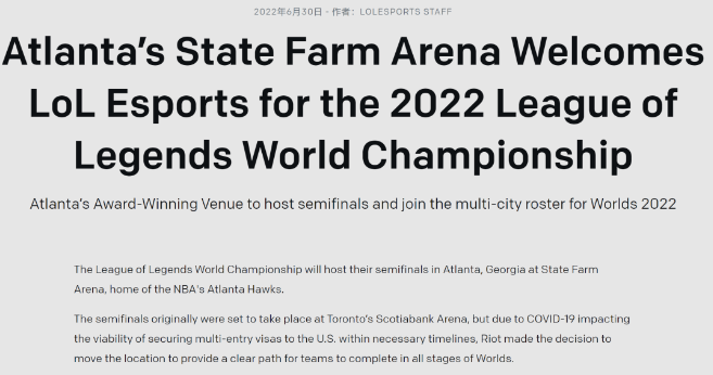 6月30日,Riot在官方网站上更新了2022英雄联盟全球总决赛的举办地点和部分细节内容。S12敲定的举办地是美国,比赛采用“巡回比赛”的方式,每个阶段会在不同的城市和场馆举行。