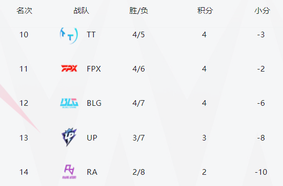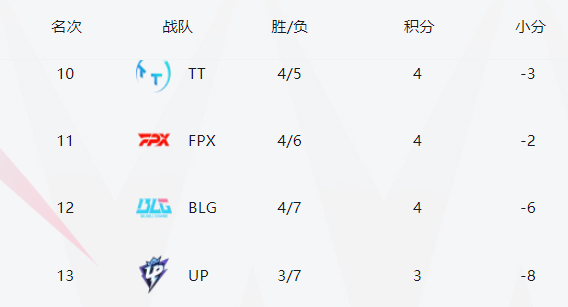 10-14名的队伍进入季后赛的可能性可以说已经微乎其微,基本上仅存在理论的可能性。当然FPX在其中是一个例外,他的赛程比较特殊,基本上强队都已经打完了,后面的6场比赛中,排名最高的AL他们也有机会能赢下来,只要能取得8-9胜,他们晋级的希望就很大。
