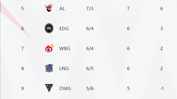 而中游的5-9名形式就比较复杂了,AL虽然是黑马,但毕竟经验不足,后面还要面对像JDG、EDG、TES、RNG这样的对手,想守住现在的名次十分困难,不过进入季后赛应该不成问题。而6名之后的队伍还季后赛的形式还有些悬念。