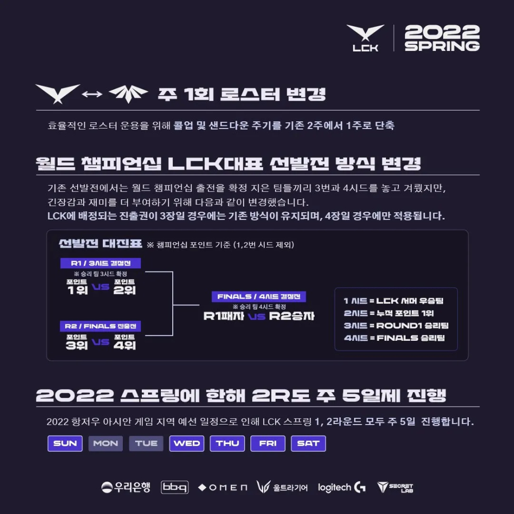 LCK官方在确认今年有四个世界赛名额之后宣布调整选拔方式,其中一二号种子的选拔方式和以往一样,夏季赛冠军和全年积分最高的队伍获得两个名额,剩下两个将通过冒泡赛选出来,但冒泡赛赛制变了,除一二号种子之外积分最高的两个队伍将进行一次BO5的对决,胜者为三号种子,积分第三第四的两个队伍打一次BO5,败者直接淘汰,胜者将和前一个BO5的败者进行对决,胜者为四号种子,简单一点就是效仿LPL双败赛制,对于LCK这种抄作业的方式不少LCK观众都表示赞同,还表示早就应该这么做了。