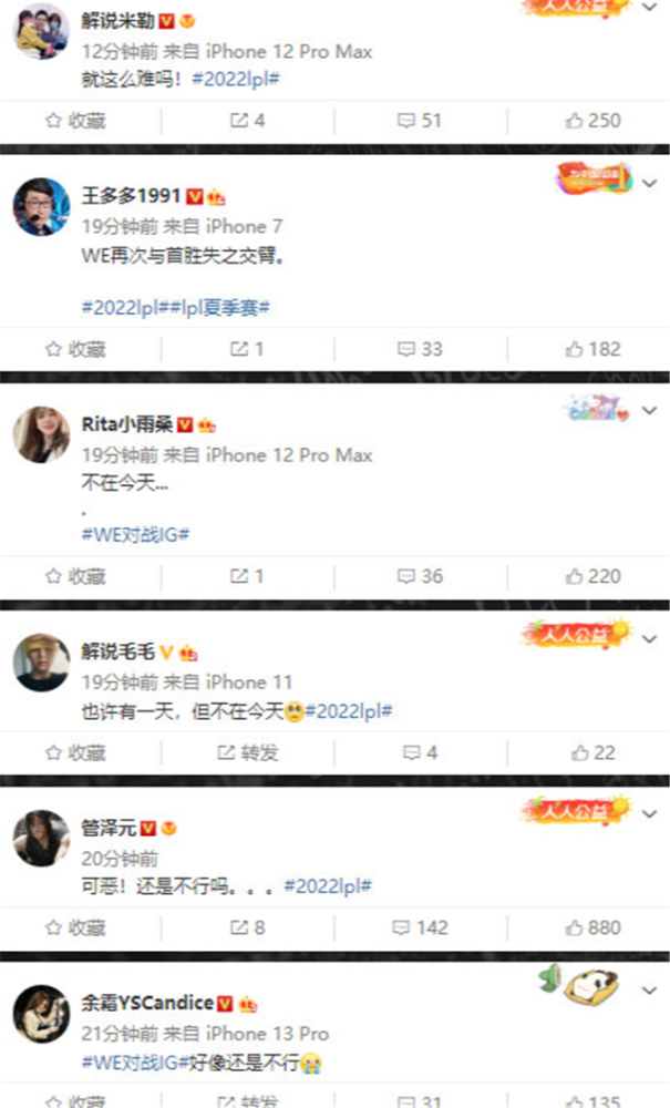 LPL的解说、主持人各种玩梗,米勒吐槽:就那么难吗?王多多是WE老朋友,感慨他们再次失败。毛毛、rita虽然不是情侣,却玩了相同的梗。余霜和管泽元不愧是老夫老妻,直呼“还是不行”,夫唱妇随。